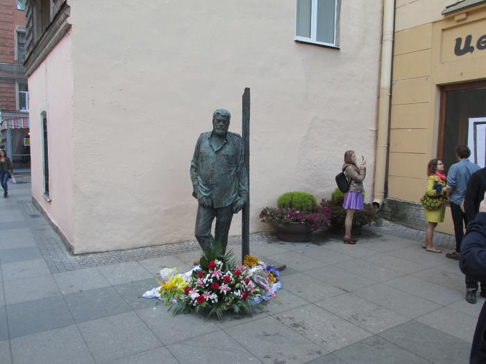 «В Петербурге pk_vsДовлатова искупали в машинном масле» — пестрят газеты в солнечный четверг 3 мая. На улице Рубинштейна около дома номер 23 в 2016 году был установлен памятник писателю Сергею Довлатову, изготовленный по проекту архитектора Вячеслава Бухаева. Памятник стоит на улице, славящейся изобилием баров, кафе и ресторанов. Сейчас эту улицу именуют в народе «Рубик». Сокращать и переделывать названия свойственно петербуржцам. С одной стороны, такое сокращение удобно, а из толпы сразу же выделяет истинного петербуржца. Но с другой стороны, мы начинаем забывать нашу историю. И я думаю, что не многие любители этой улицы знают историю происхождения ее названия: в 1929 году улицу назвали в честь композитора Антона Григорьевича Рубинштейна, который жил в 38 доме. На Рубинштейна практически в каждом доме жили известные люди, и практически каждый дом является объектом культурного наследия, поэтому за улицей власти стараются следить. А помогают в этом те, кто держит рестораны на этой улице. В теплое весеннее утро на Рубинштейна появляется радуга: каждый моет улицу около своего ресторана. После принятия душа улица одевается в стулья и столы с белыми скатертями, а вечером надевает сережки: на столы скатертями ставят свечи. Улица очень гостеприимна и всегда вмещает большое количество гостей. В субботние вечера смотрится наиболее празднично. Правда не знаю, как живут люди в квартирах, чьи окна выходят на эту гостеприимную улочку. Улица всегда веселая, а когда на ней случаются неприятности она очень расстраивается. 3 мая улица сильно расстроилась, потому что прекрасный памятник рабочие, разбиравшие веранду ресторана, который находится около памятника, облили маслом. Они старались отмыть памятник, но как пишут СМИ, у них получилось плохо. Но после солнечного четверга наступила дождливая пятница, и, по-моему, сейчас памятник находится в хорошем состоянии.