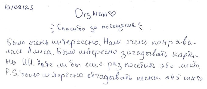 Елена Андреева: Особенно ярко запомнилась природа и огромные дубы неимоверной красоты, а также высокие-высокие деревья. Я даже заметила на обратном пути из Пушкинских гор, что деревья становились всё ниже и ниже. Конечно, домик Довлатова меня потряс абсолютно – очень здорово, что его сохранили именно так, как он там жил ничего не приукрасили. Ничего лишнего и это просто потрясающе.