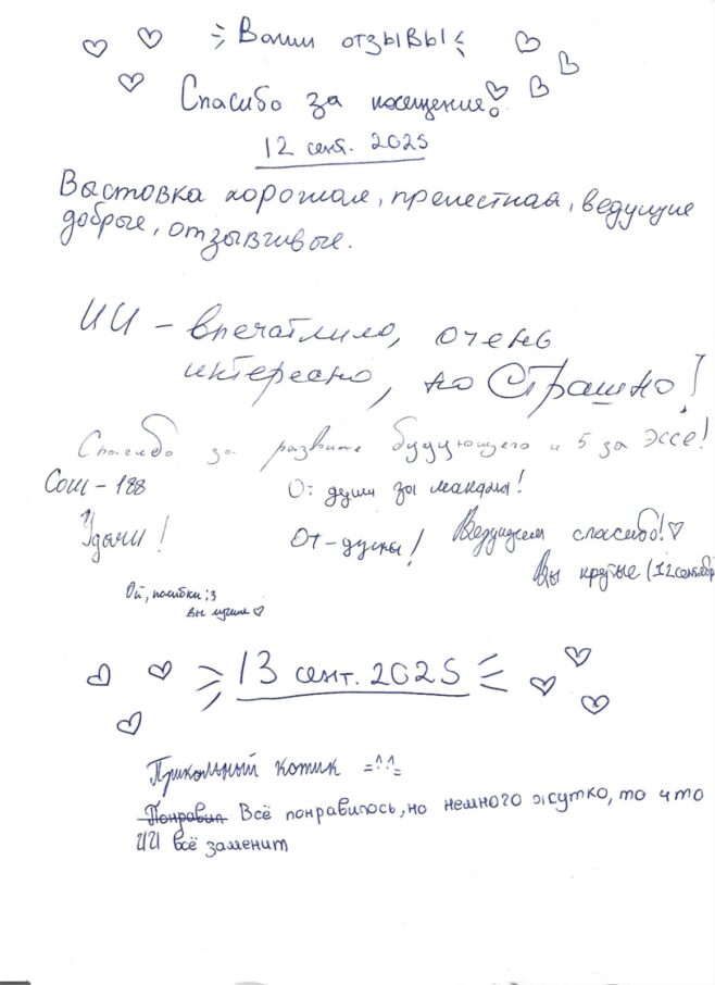 «Песни Панфила» и встреча с Дарьей ЧирвойВо второй фестивальный день состоялся концерт, необычный по своей сути не только для нашей фестивальной сцены, но и для творческого мира в целом. Художественный руководитель фестиваля, Валерий Панфилов, создал буффонаду, главная загвоздка которой заключалась в том, что тексты песен действительно были написаны самим Валерием, но музыка к ним была создана при помощи искусственного интеллекта.Музыкальные композиции, получившиеся в результате такого творческого союза, были показаны на сцене пока ещё не роботами, но живыми людьми: артисты представили несколько драматических номеров по тематике каждой песни. Многим зрителям хорошо запомнилось это представление, и все дни фестиваля можно было слышать, как кто-нибудь напевает себе под нос музыкальные мотивы из концерта.Так как наш фестиваль стремится не только познакомить зрителя с новейшими технологиями, но и изучить более глубокие вопросы, связанные с их применением, после концерта «Песни Панфила» была организована творческая встреча с Дарьей Чирвой, которая в своей научной и педагогической деятельности занимается вопросами этики в применении искусственного интеллекта. Во время встречи состоялась дискуссия, которая оставила зрителям больше вопросов, чем ответов, чего не избежать при обсуждении таких многогранных по своей сложности тем. Дарья поделилась с нами своими впечатлениями после фестиваля и проведения встречи в таком необычном формате.